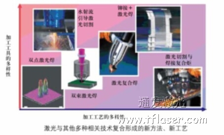 就拿激光焊接技術來說,在激光復合工藝的發展中已出現了如雙點或雙束激光的復合、激光與電弧的復合、激光與攪拌摩擦熱復合以及激光與電阻熱復合等形式;并呈現與其他相關技術結合及功能延伸的趨勢,如與水射流、鉚接等結合而形成的新工藝(見圖)。