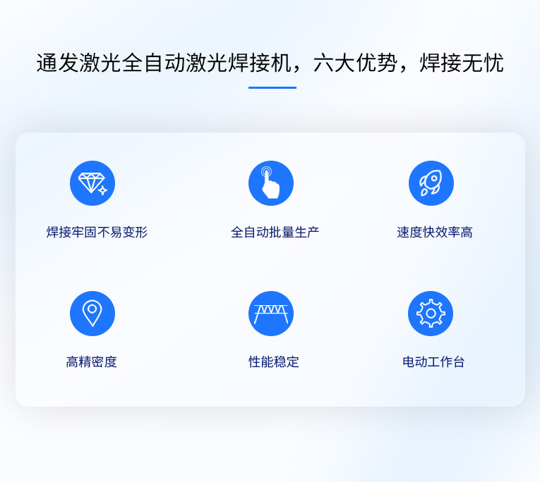 通發(fā)激光TFL-300V全自動激光焊接機,廣泛適用各種不銹鋼五金的激光焊接。可實現(xiàn)大多數(shù)0.8mm以內(nèi)料厚五金產(chǎn)品的二維平面焊接。效率高,性能穩(wěn)定,性價比高。配置精密運動控制器和工作臺高速運動實現(xiàn)焊接。